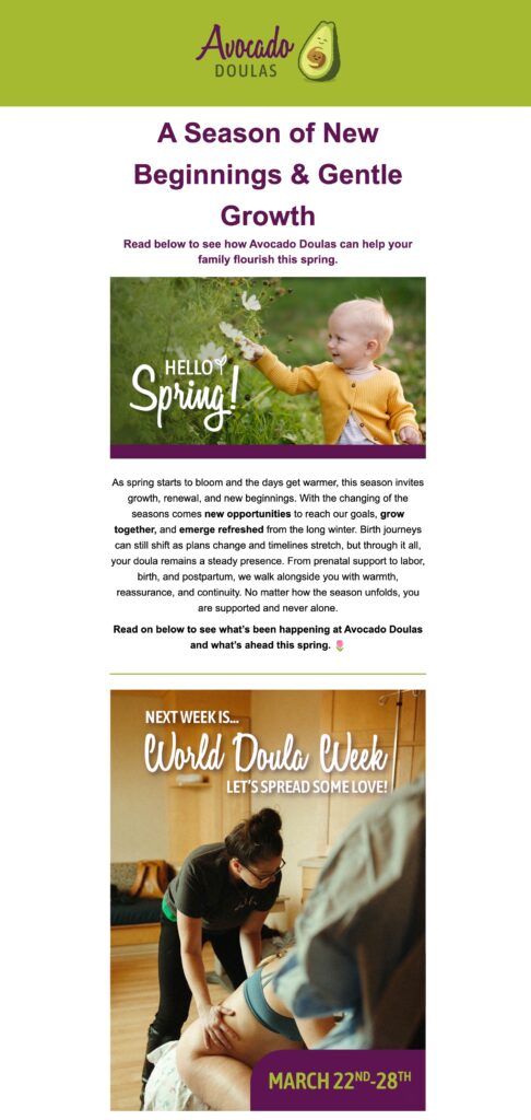 As a mom-founded business with a deep appreciation for the vital support doulas provide, I truly love partnering with them. Avocado Doulas has been a valued, ongoing client, and our collaboration continues to be both meaningful and inspiring. We take pride in serving as their trusted creative team, and we look forward to growing and working together for many years to come.