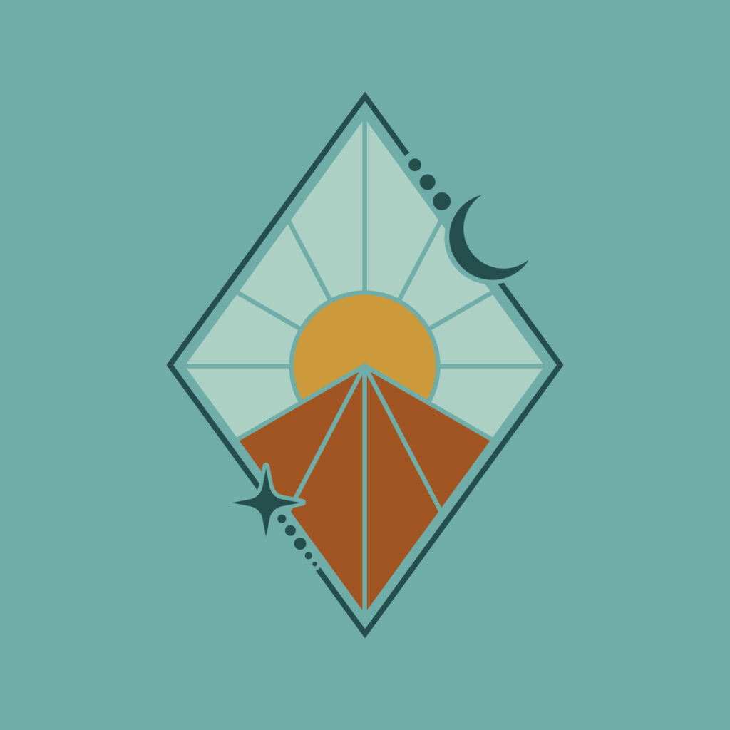 The logo builds on this balance, inspired by the Egyptian story of Geb and Nut. A radiant sun sits at the center, symbolizing energy, clarity, and renewal. Below it, a pyramid form represents the earth or a mountain, grounding the mark in stability and growth. Surrounding these elements, a continuous line weaves together the moon, planets, and stars, creating a sense of connection and flow between the earthly and the cosmic. The composition reflects alignment, unity, and a deep sense of balance.