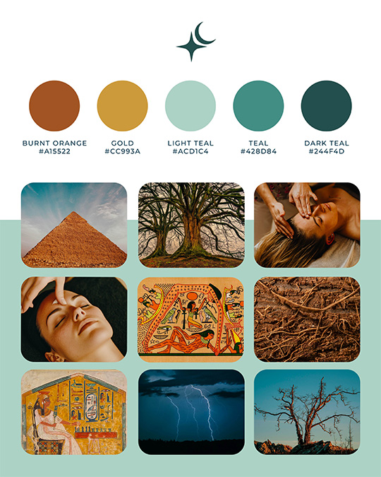 The color palette was intentionally designed to reflect the harmony between earth and sky. Deep blues and teals evoke openness, flow, and healing energy, while warm golds and rust tones bring in a sense of grounding, vitality, and transformation. Together, they create a visual language that feels both stable and alive, mirroring the balance of stillness and movement within Craniosacral Therapy. The result is a palette that feels organic, spiritual, and expansive.